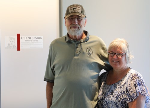 Pictured Above: Glen and Patricia Norman stand outside the Ted Norman Training Centre at EQUS' Corporate Office. Ted Norman envisioned a future in which REAs were stronger together. Ted joined the Bowden REA as the Secretary of the Board in 1948, shortly after he returned from his service with the Canadian Armed Forces in WWII. Ted was instrumental in the formation of Central Alberta REA in 1992, and remained on the Board until his retirement in 1997. The Ted Norman Training Centre commemorates Ted's nearly 50 years of service to the REAs and his community.