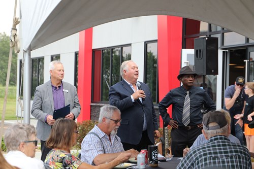 Pictured Above: EQUS CEO Andy Metzger (left), and Board Chair, Glen Fox (right), are joined by Red Deer County Mayor, Jim Wood, to speak to guests at EQUS' Corporate Office Anniversary Celebration.