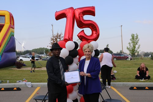 Pictured Above: Innisfail Mayor, Jean Barclay, presents EQUS Board Chair, Glen Fox, with a certificate recognizing many years of contributions to the community.